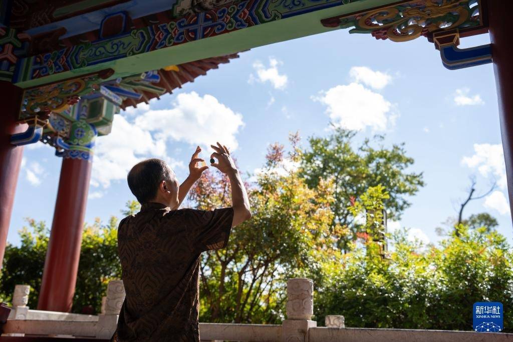 11月20日,李国伟在保山市永子棋院永昌阁前远眺。新华社记者 高咏薇 摄